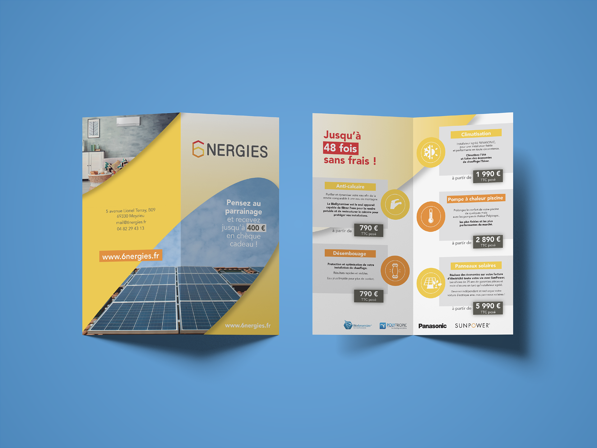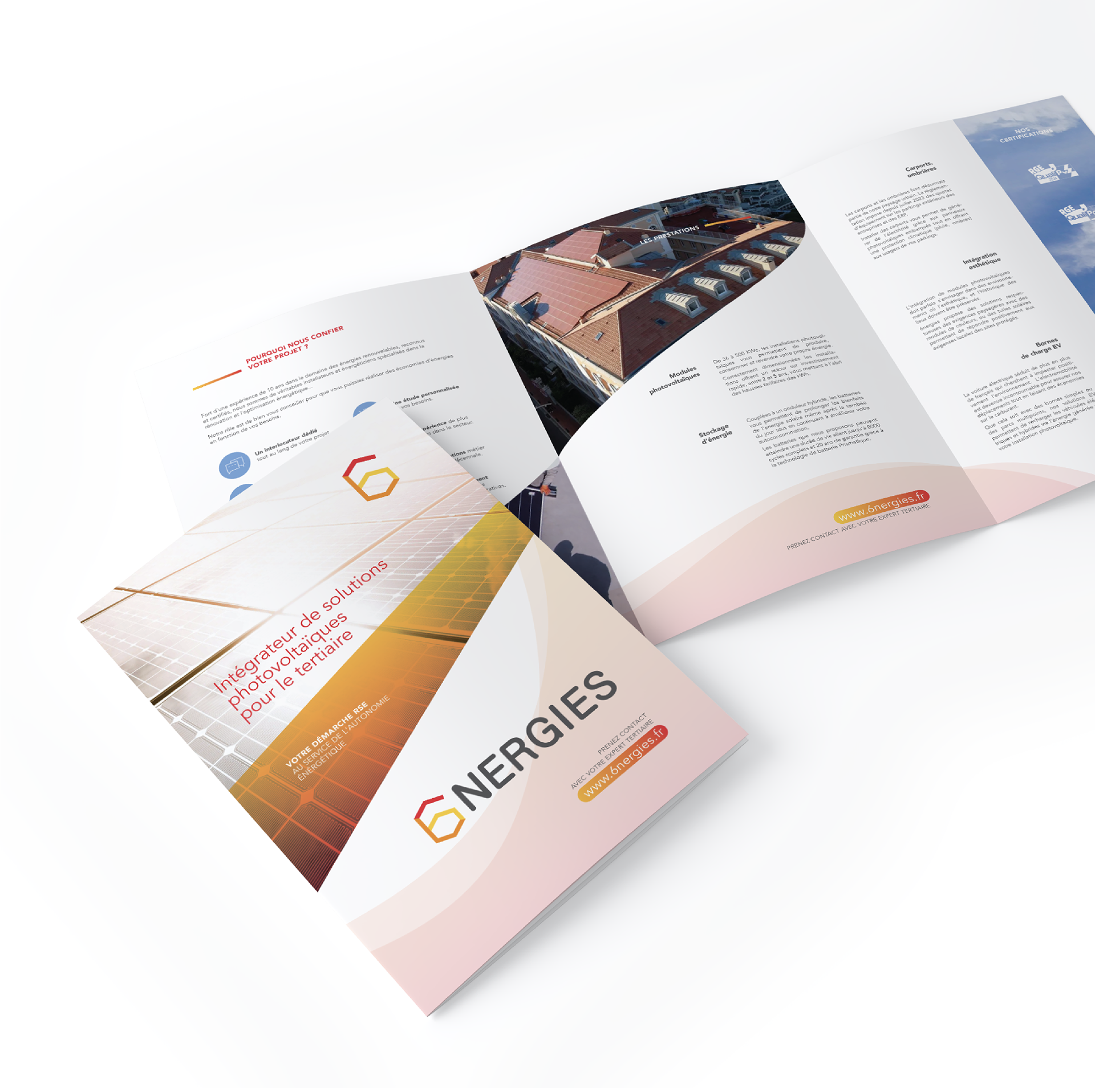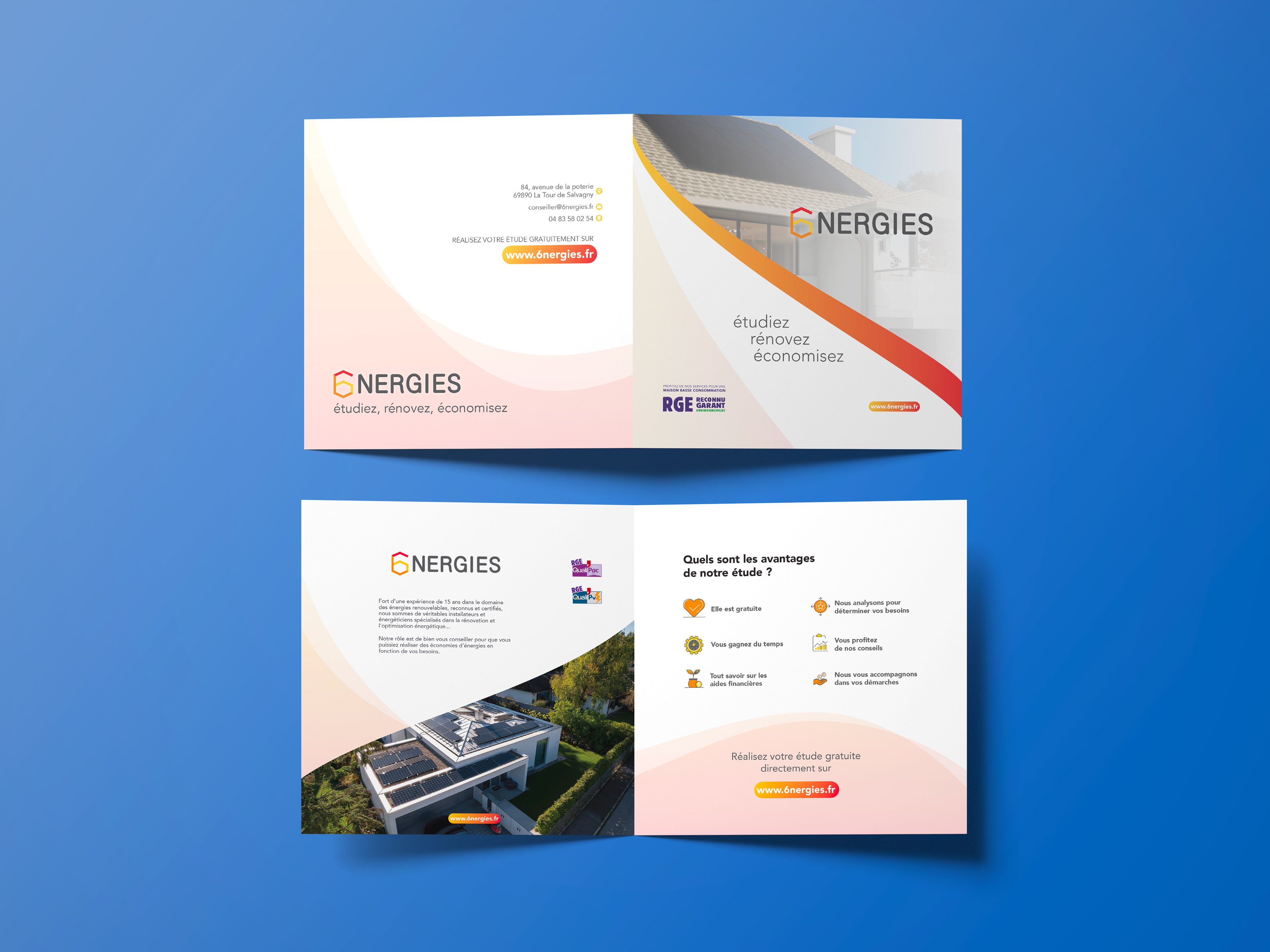 Supports de communication et promotionnels pour l'entreprise 6nergies : cartes de visite, documents administratifs, brochure B2B, flyer d'annonces tarifaires...