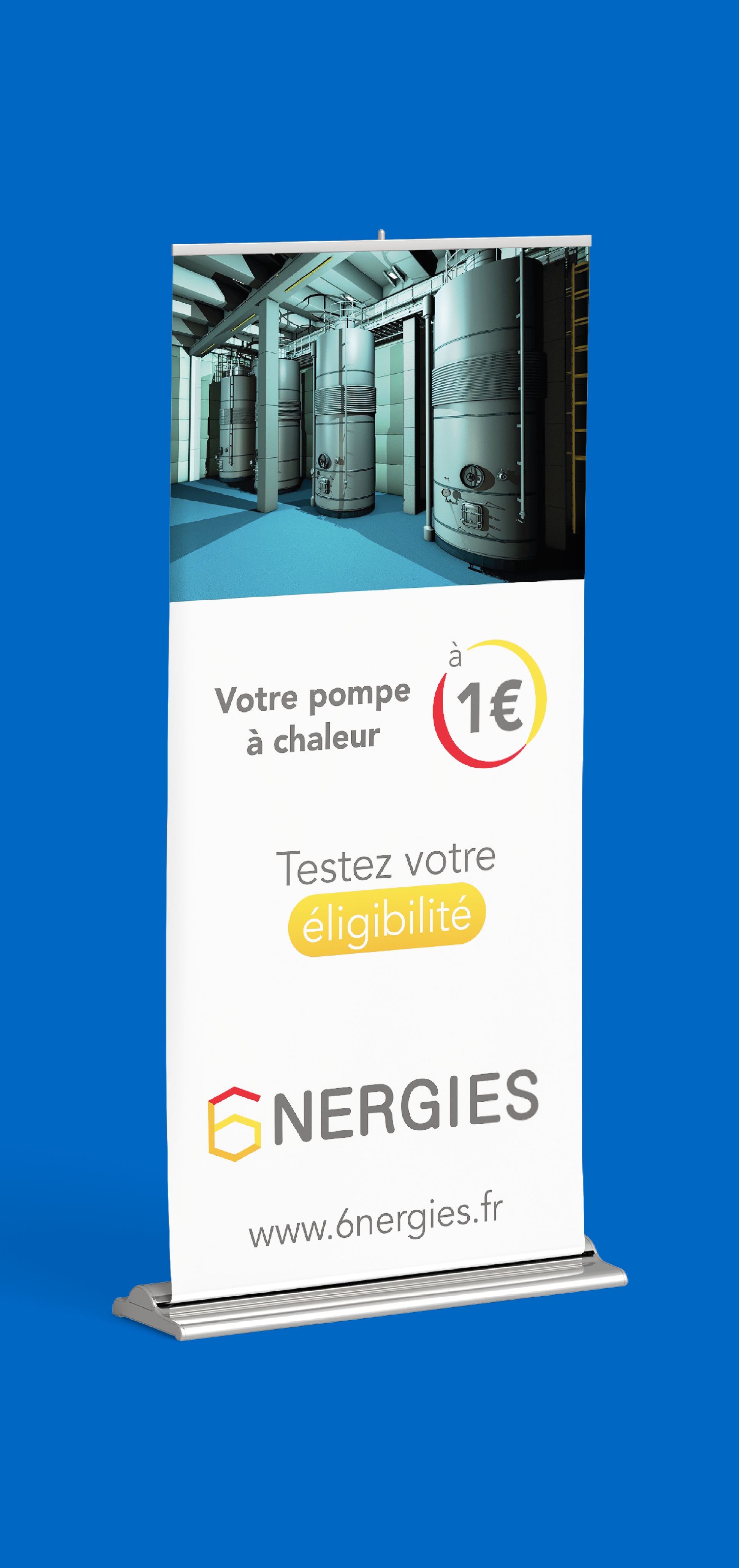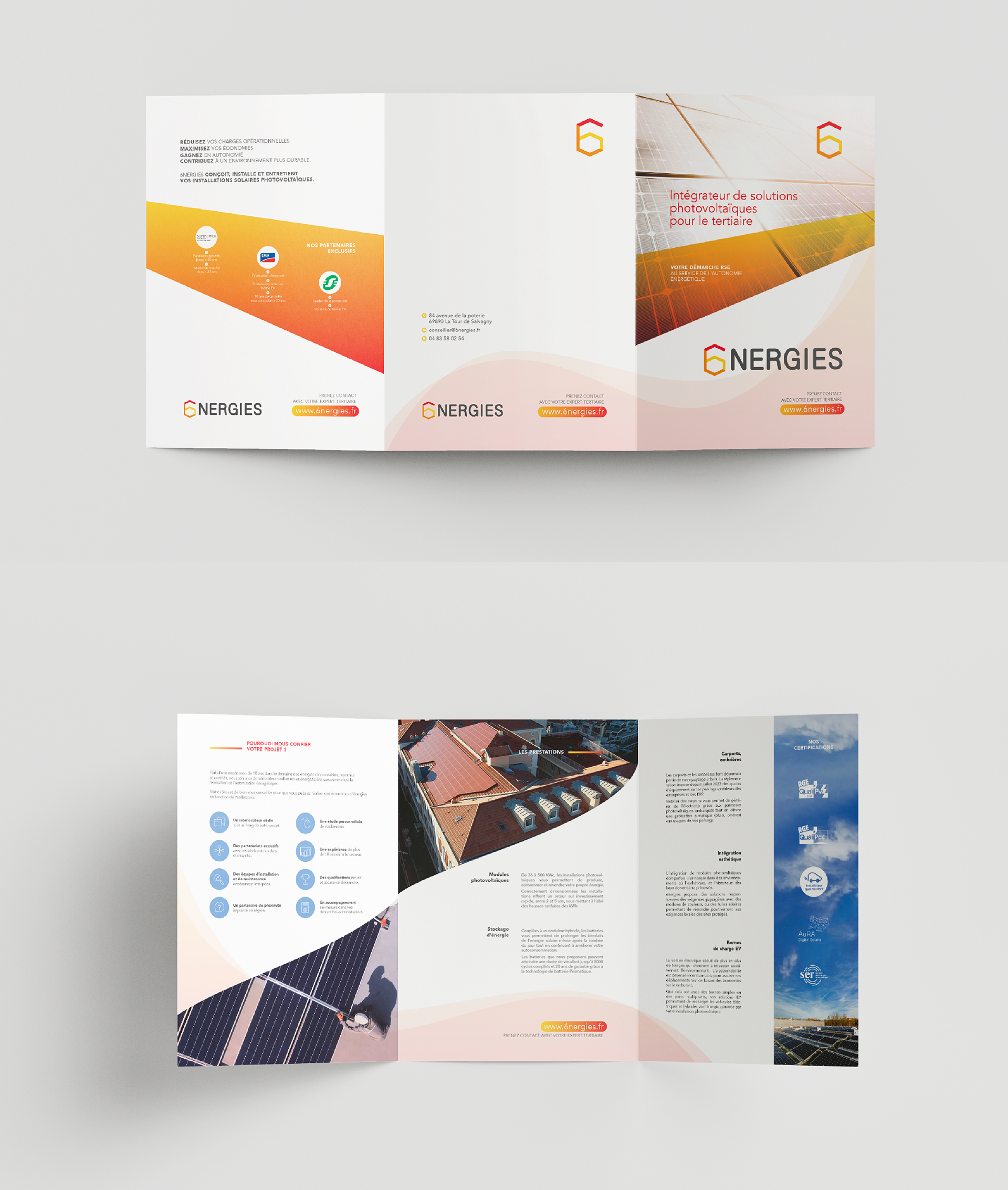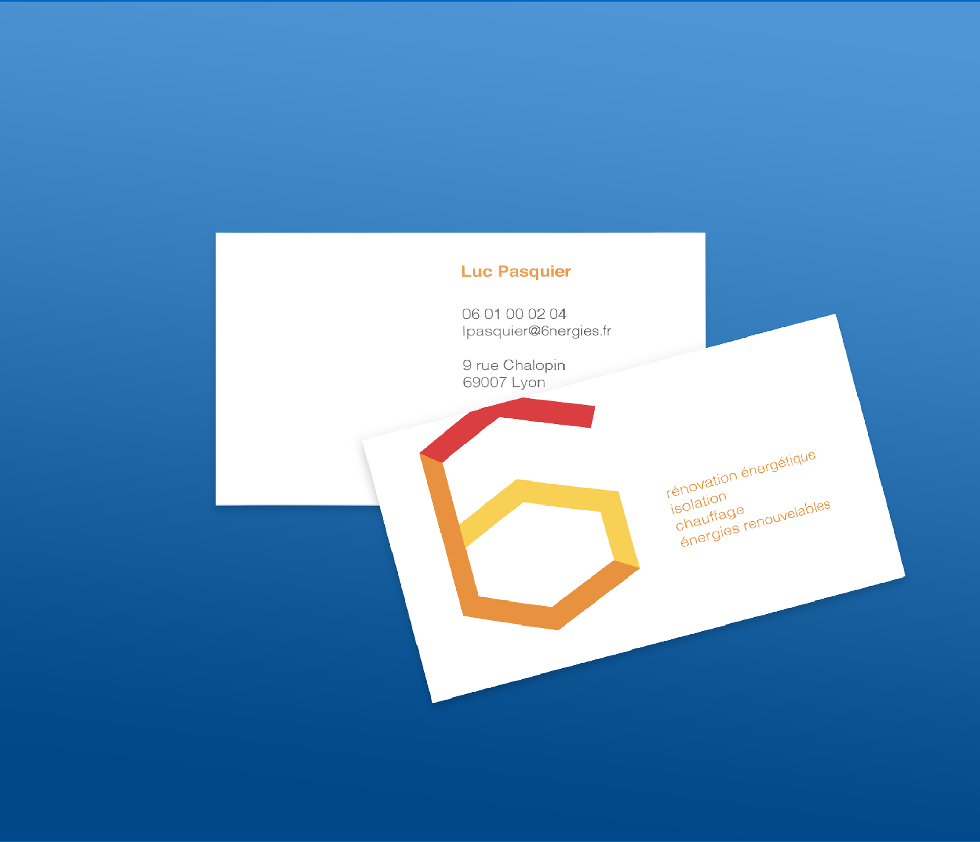 Supports de communication et promotionnels pour l'entreprise 6nergies : cartes de visite, documents administratifs, brochure B2B, flyer d'annonces tarifaires...