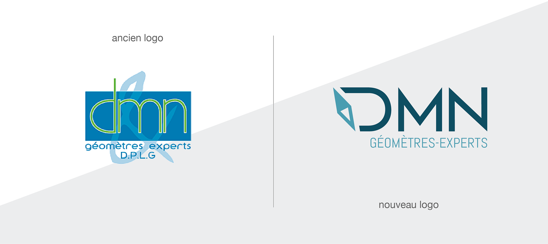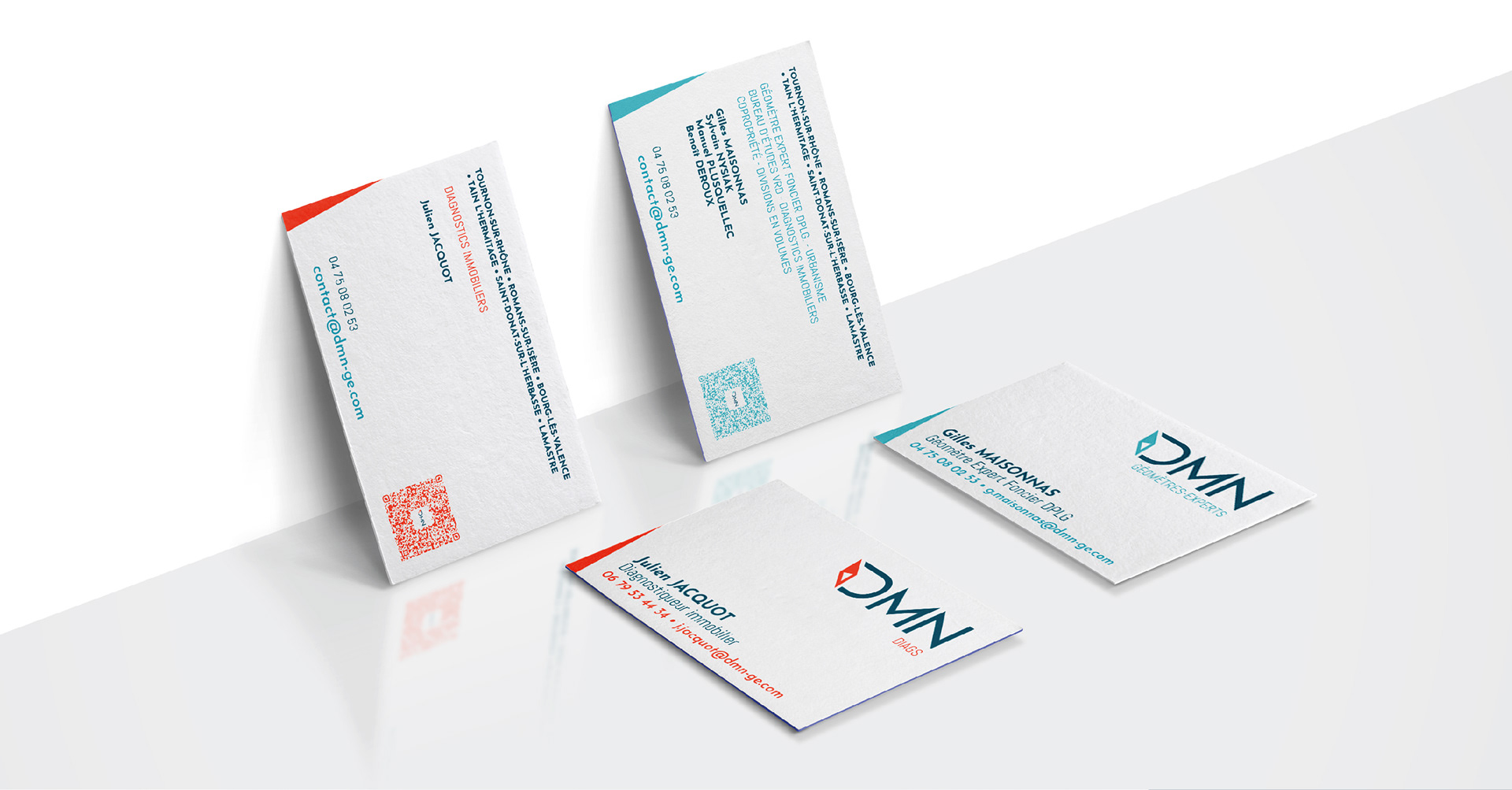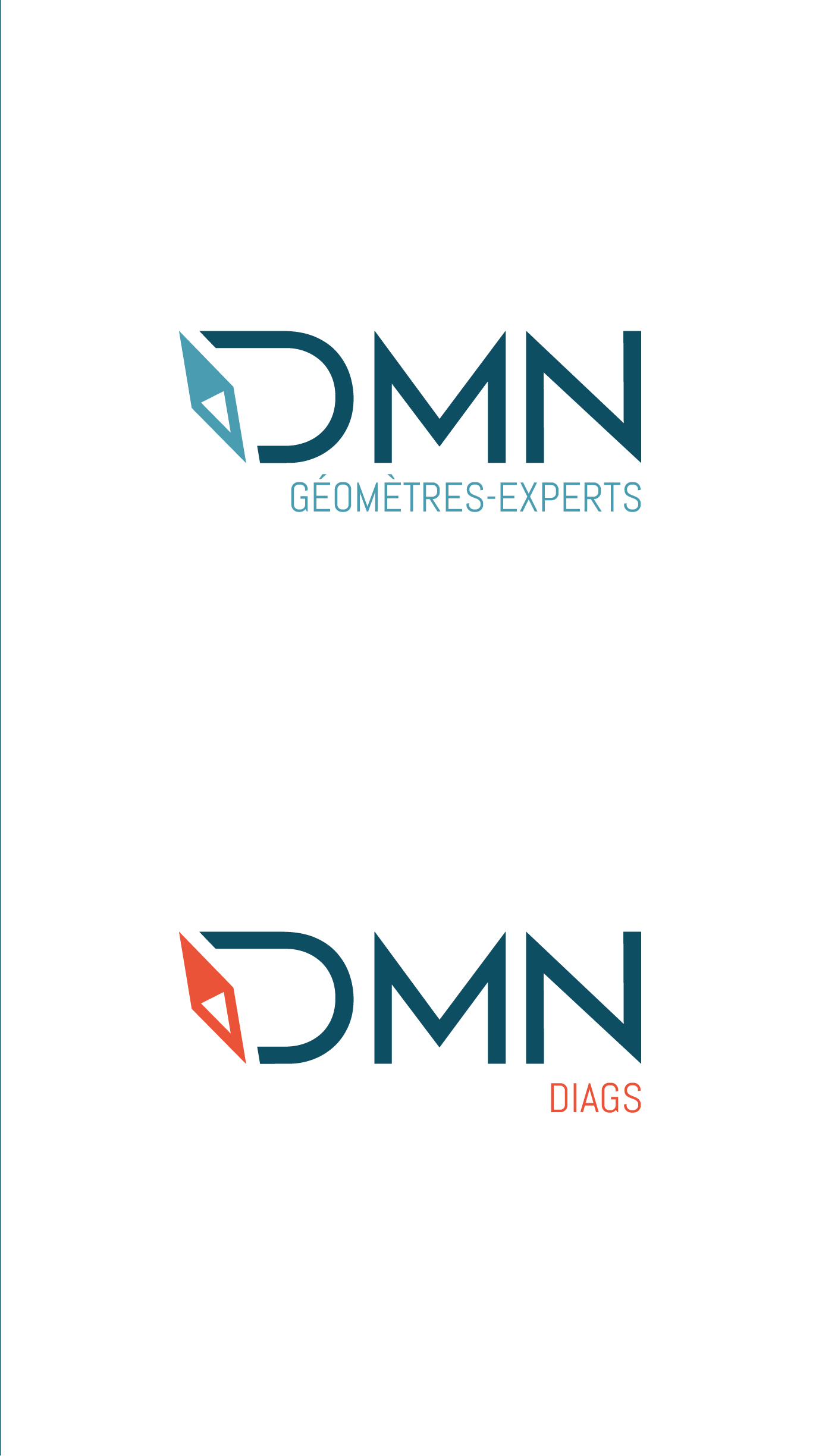 Refonte de l'identité visuelle des géomètres de DMN : logo DMN géomètre-experts, déclinaison logo DMN diag, cartes de visites, signalétique, documents administratifs.