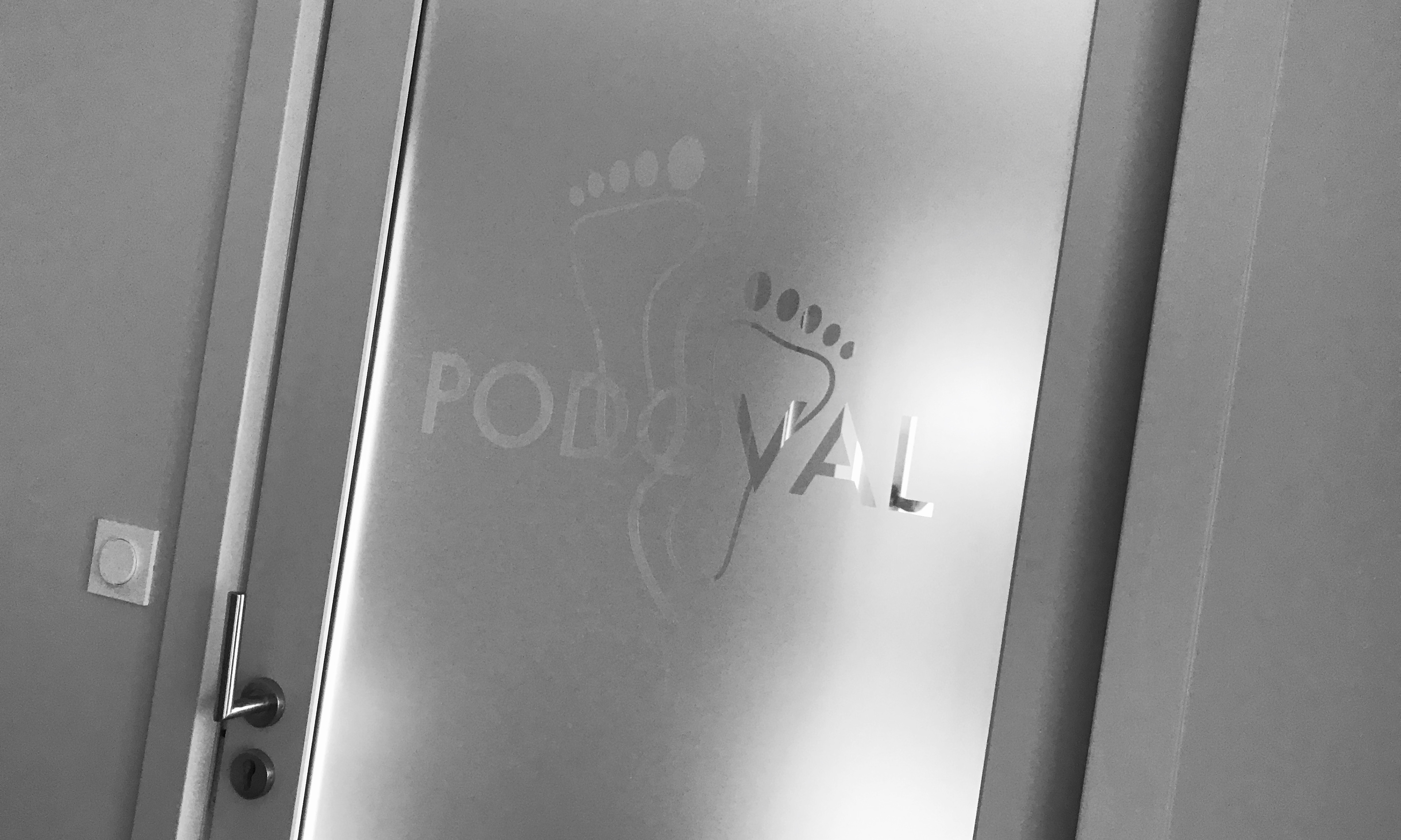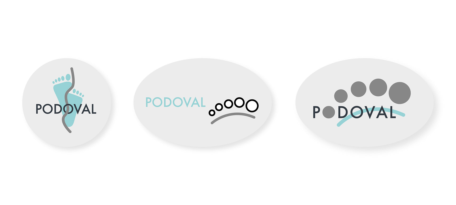 Identité visuelle pour le cabinet de podologues Podoval : logo, cartes de visite et signalétique.